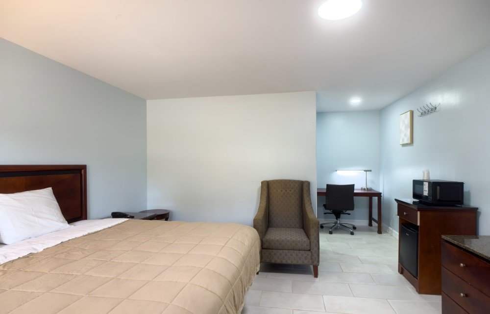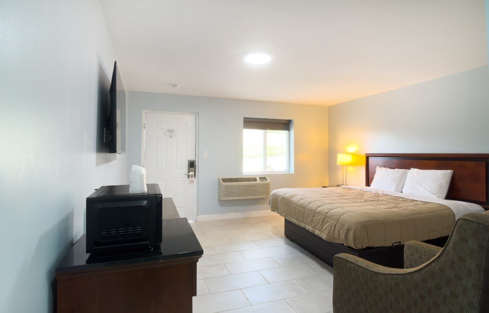 At the center of the room is a generously sized king bed, designed to offer dependable sleep comfort. The mattress provides balanced support, while clean linens, standard pillows, and breathable bedding help maintain a restful temperature through the night. A sturdy bed frame minimizes movement, allowing uninterrupted rest even after long travel hours. Nearby seating options, such as a simple chair or bench, add flexibility for guests who wish to sit, organize belongings, or enjoy a quiet moment without using the bed. Flooring is easy to maintain and comfortable underfoot, contributing to a sense of cleanliness throughout the space.